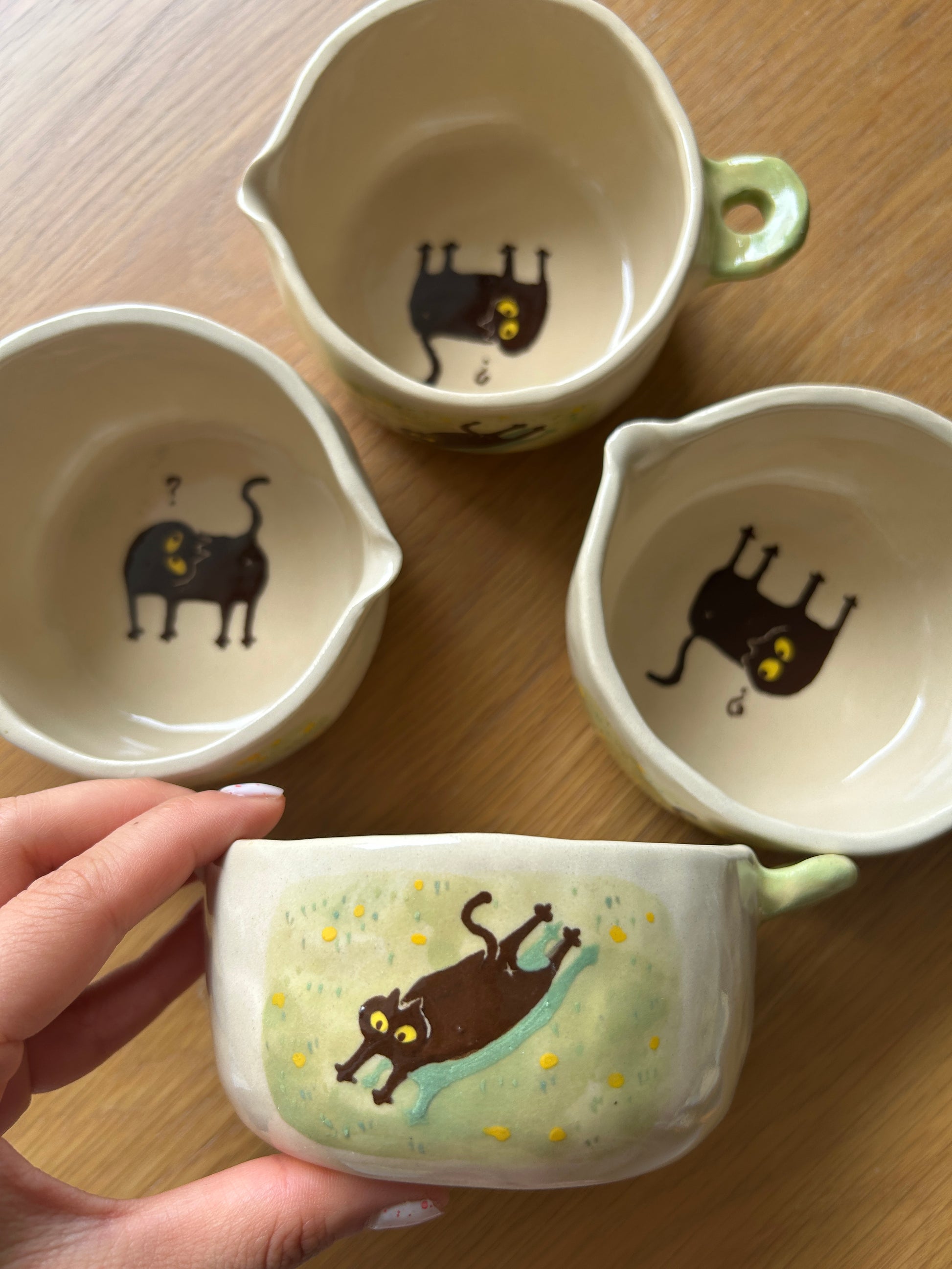 Ajoutez de la poésie à vos pauses thé ou café avec cette tasse en céramique artisanale, entièrement modelée et peinte à la main par Anna. Chaque pièce est unique, mettant en scène son chat Félix, un petit chat noir aux yeux malicieux, jouant avec tout plein de choses.